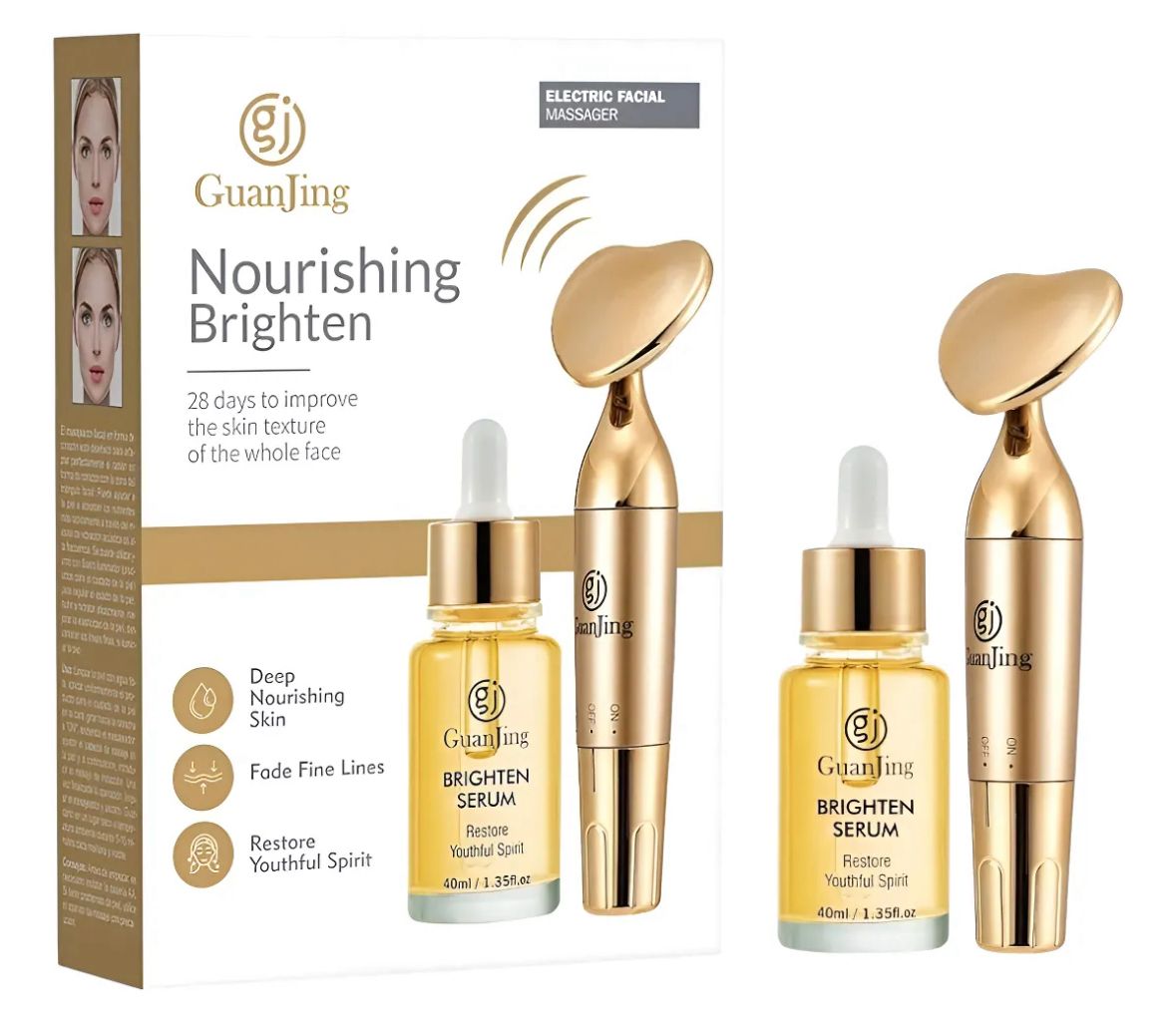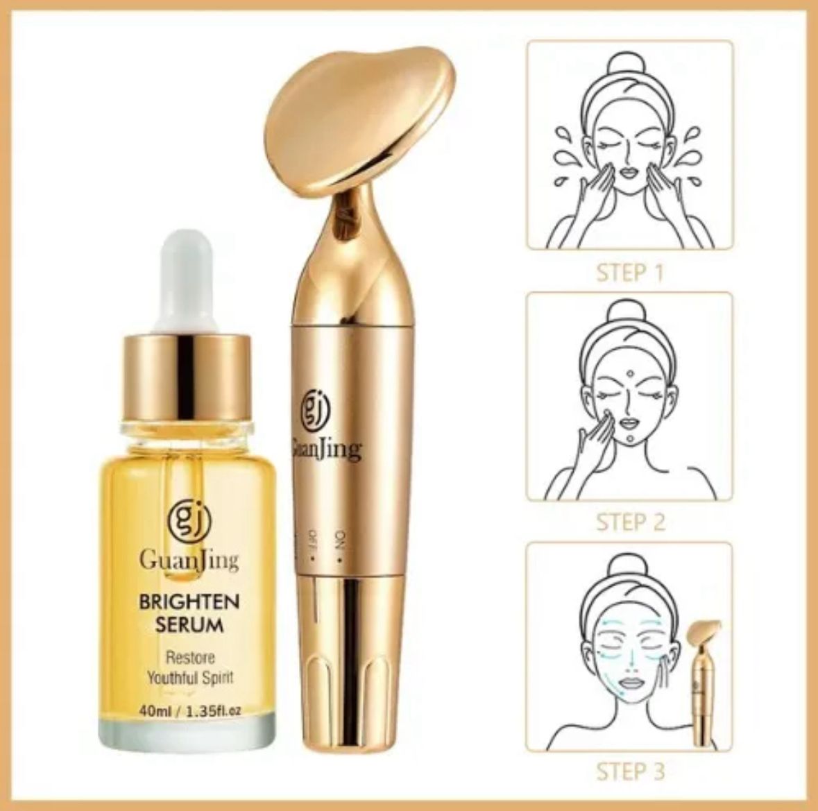 Uso: Limpie la piel con agua tibia, aplique el producto uniformemente en el rostro, gire a la derecha para encender el masajeador y ajuste el cabezal contra la piel para iniciar el masaje de inducción. Una vez finalizado, limpie el masajeador y séquelo al aire. Guárdelo en un lugar seco a temperatura ambiente. De 5 a 10 minutos por la mañana y por la noche.